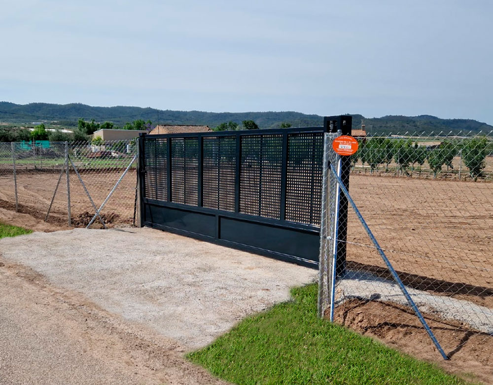 Puerta corredera compuesta por barrotes con un acabado lacado negro mate (9005) y con la parte inferior con un zócalo chapa pegaso lacado.