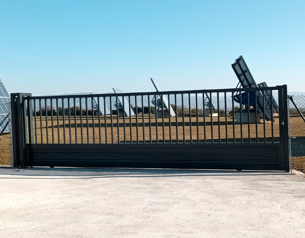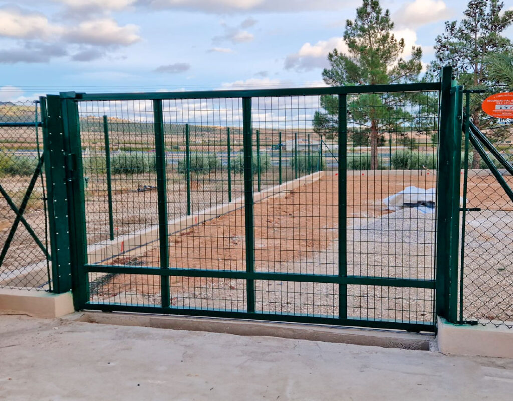 Puerta corredera compuesta por un mallazo liso con un acabado lacado verde (6005), así como unas de sus características formada por un PDS26 para asegurar que se mantenga una posición correcta según la estructura.