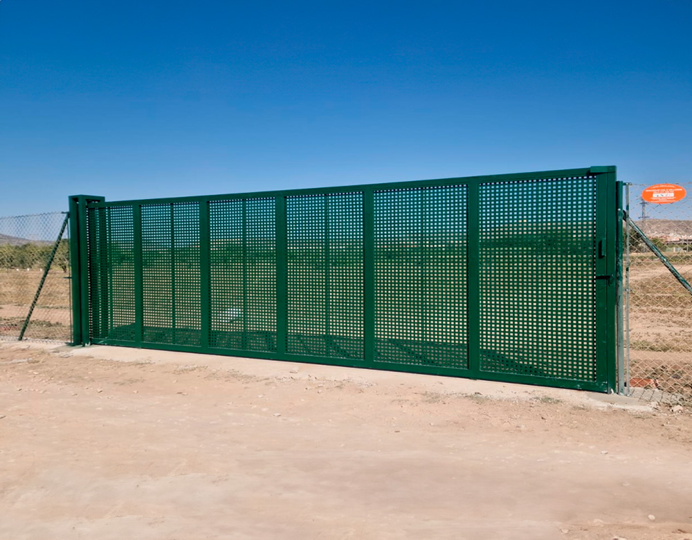 Puerta corredera formada por una chapa perforada con un acabado lacado verde (6005) con una medida estándar según la necesidad de nuestros clientes.