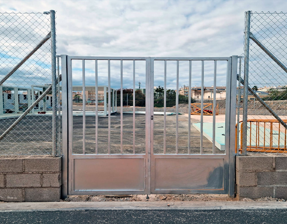Puerta galvanizada con barrotes (2 hojas) con el parte inferior formado con faldón chapa lisa galvanizada.