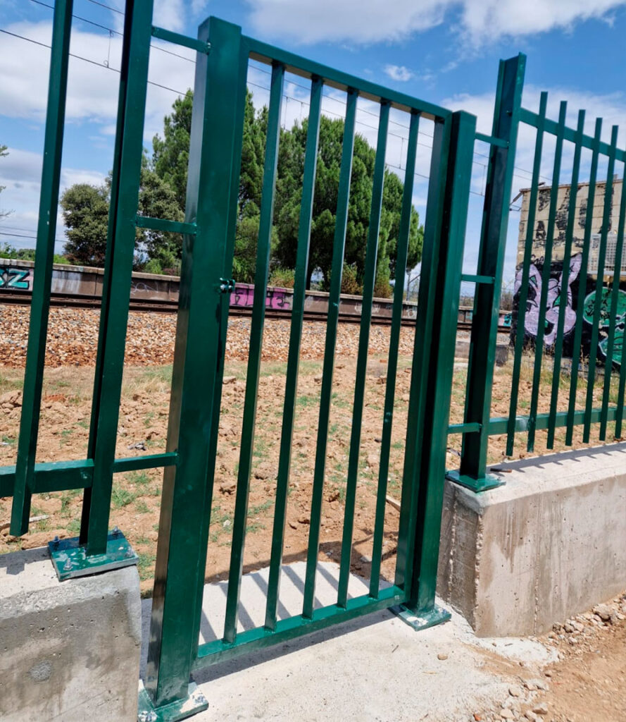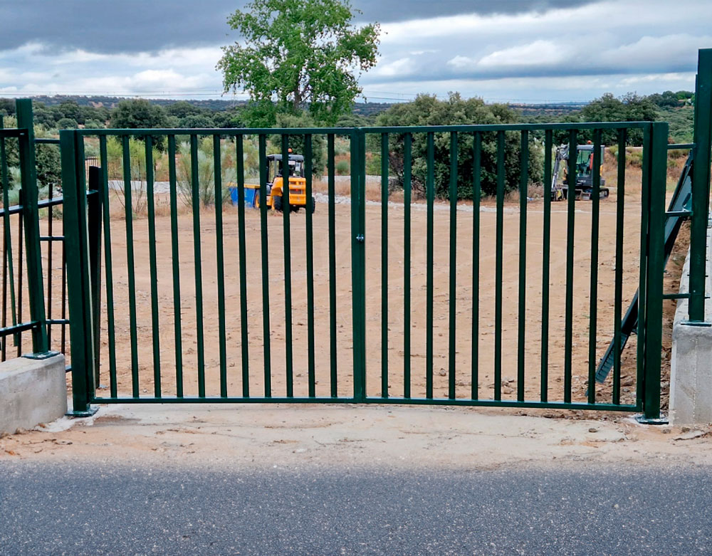 Puerta con barrotes (2 hojas) con un acabado lacado verde (6005) formado con dos postes cuadrados en cada lado para su buena sujetación.