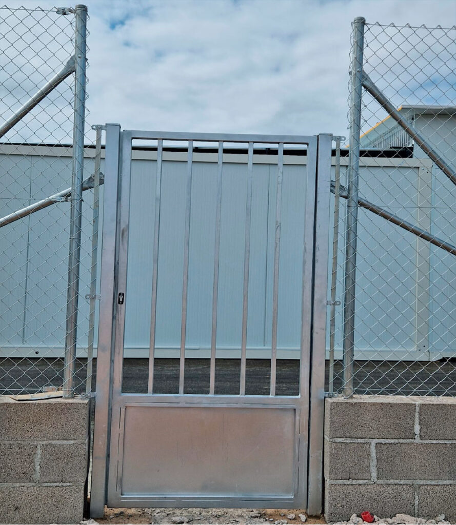 Puerta galvanizada con barrotes (1 hoja) con la parte inferior con chapa lisa con postes cuadrado a cada lado para la colocación de la puerta.